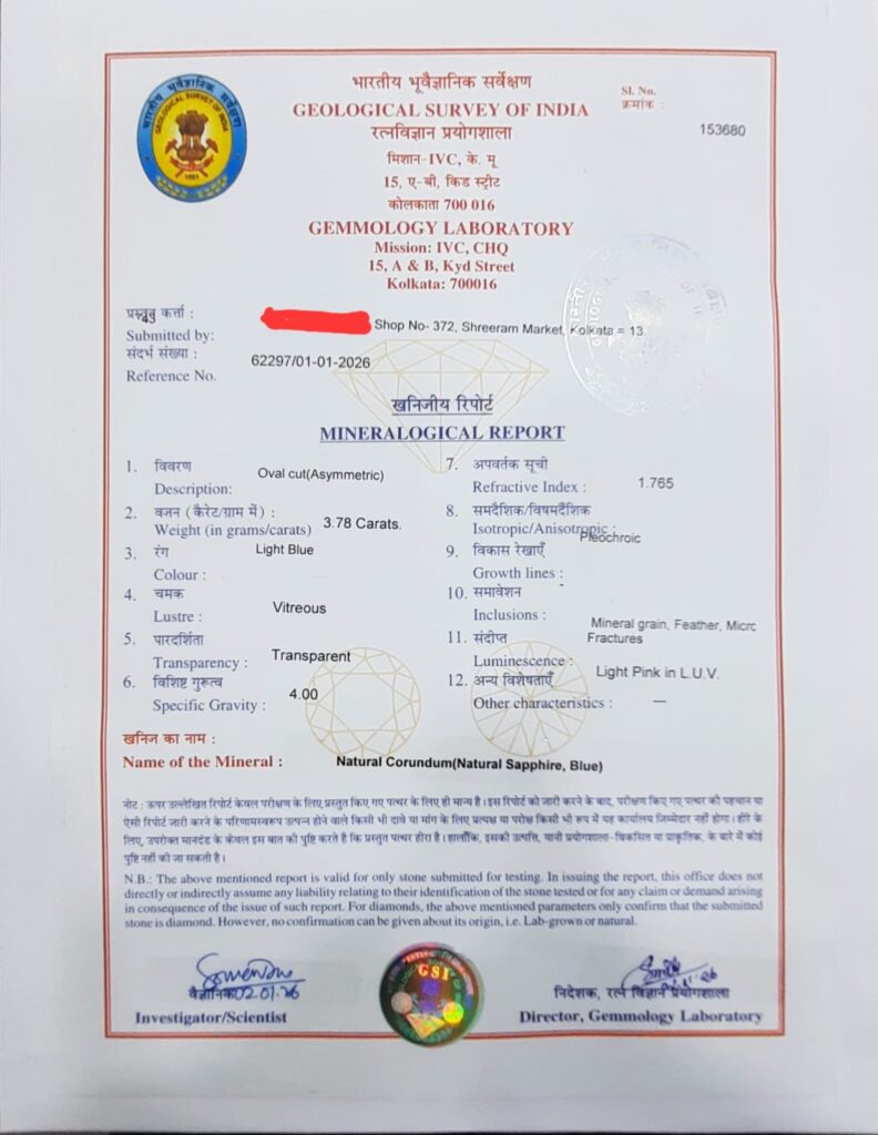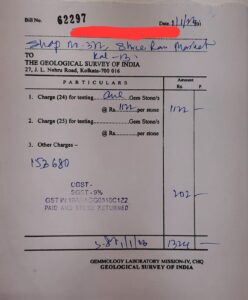 Note : G.S.I lab here in the context refers to Geological Survey of India at Kolkata , which is the only Government of India direct laboratory dealing with testing of all precious and semi gemstones having mineral content.