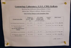 GSI is the only direct Government institute engaged in Gem testing service. They test only loose gemstones and take amost 2 days for testing. The charges as per GSI notification is mentioned below for reference.